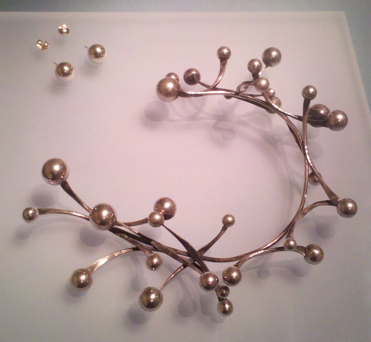 I was shocked to find that the Brooklyn Museum of Art is like the Metropolitan Museum in scope and perhaps even in scale (see photo at the top of the Greek revival and modern exterior) but with a quirky Brooklyn style and focus. They have antiquities from Ancient Egypt (yes, even a coffin and mummy board) to modern jewelry makers like Brooklyn artist Art Smith (see "Galaxy earrings and necklace at right).